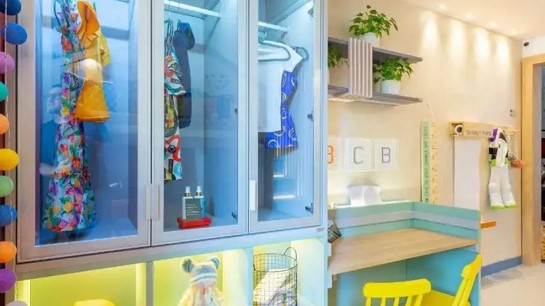 Para fazer este sonho acontecer, a Criare Abel Cabral foi a responsável por projetar os móveis que moldam todo o espaço, contando com uma cama beliche feita sob medida, tablado para brincadeiras, espaço de guarda-roupa e mesa evolutiva, que vai acompanhando o crescimento da criança e pode ser adaptada para ser usada em todas as idades.