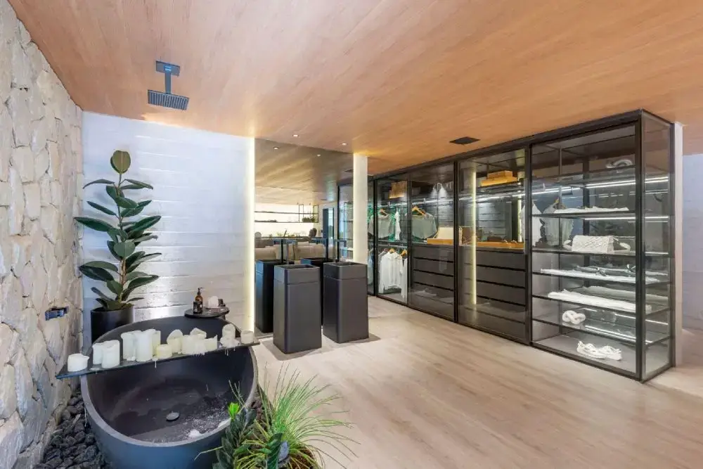 Para o quarto, a marca executou um ripado orgânico para compor a decoração. Já o closet foi pensado como um guarda-roupa vitrine, trazendo muito vidro e prateleiras Luzze no acabamento Mocatto.