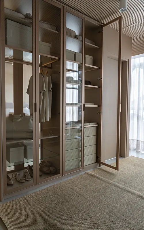 O vidro aparece como um aliado estratégico, seja em portas de correr, prateleiras ou nichos. Sua transparência adiciona modernidade e leveza, ao mesmo tempo em que valoriza peças em exposição sem comprometer o estilo minimalista. Em closets abertos, o uso desse material também contribui para a sensação de organização, já que cria um visual limpo e sofisticado.